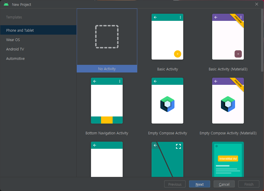 암것도 없이 그냥 프로젝트 만들기 부터 시작. 뭐 기본 세팅된거로 할 수도 있는데 그럼 나중에 공부하면서 배우기 애매해서 그냥 No Activity 선택