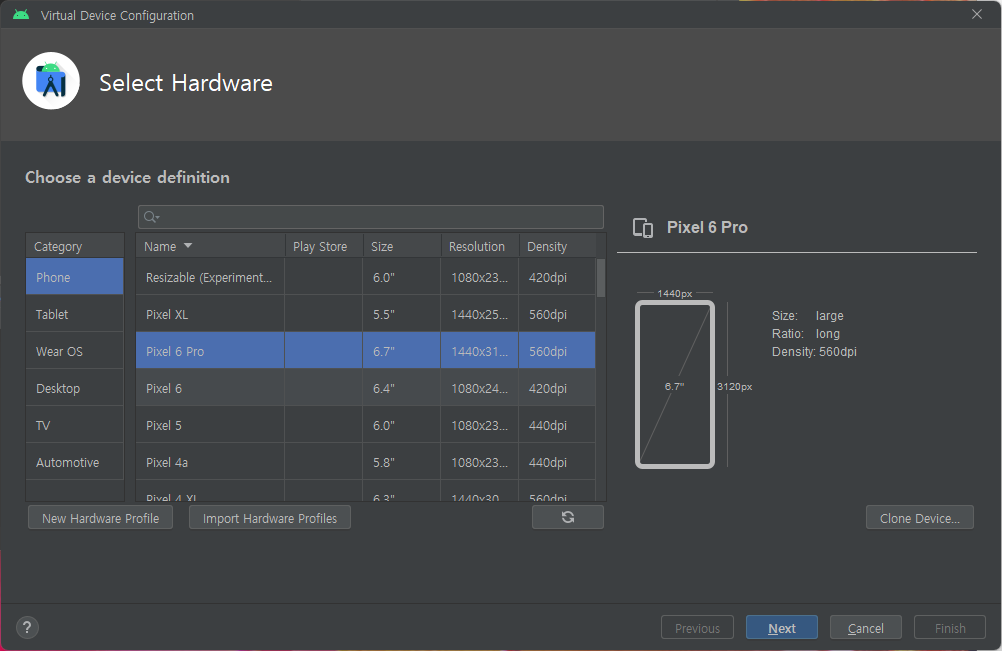 그럼 아래처럼 Virtual Device를 세팅할 수 있게 나오는데 폰으로 그냥 대충 암거나 하면 됨 적당히 큰 사이즈 하면 되겠지
