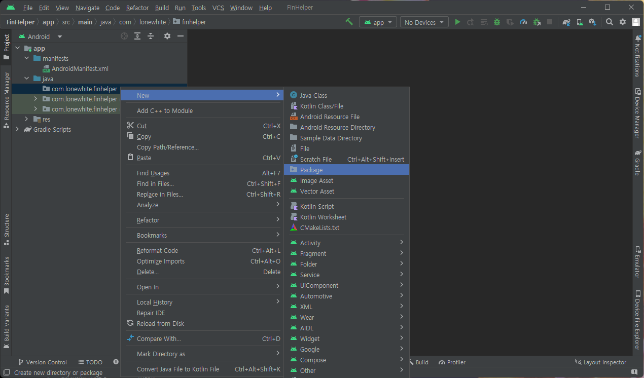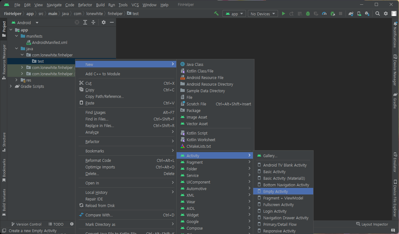 그리고 추가된 패키지에 빈 액티비티 하나 추가! 이름은 대충.