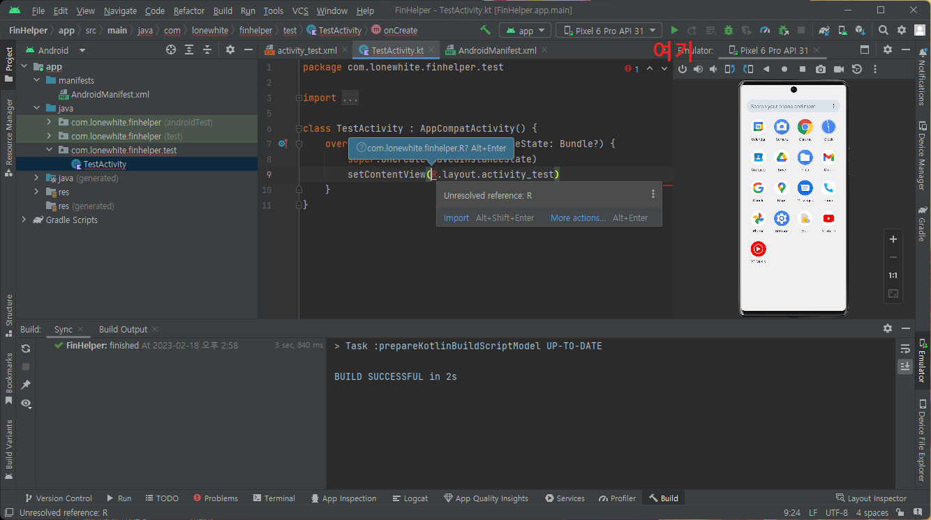 근데 아래처럼 빌드 에러 나네. 리소스 파일을 임포트 하고 다시하면 됨. R에 마우스 커서 올리고 알트 엔터! 그리고 다시 실행 버튼을 눌러서 빌드, 설치 및 실행 가보자!