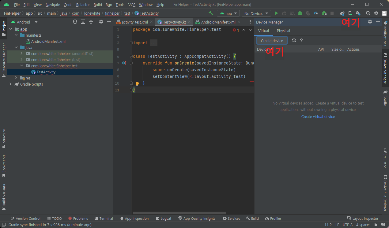 그러면 알아서 layout 파일도 생성해주지. 그럼 한번 실행해볼가? 실행을 위해서는 Virtual Device를 만들어야겠지?