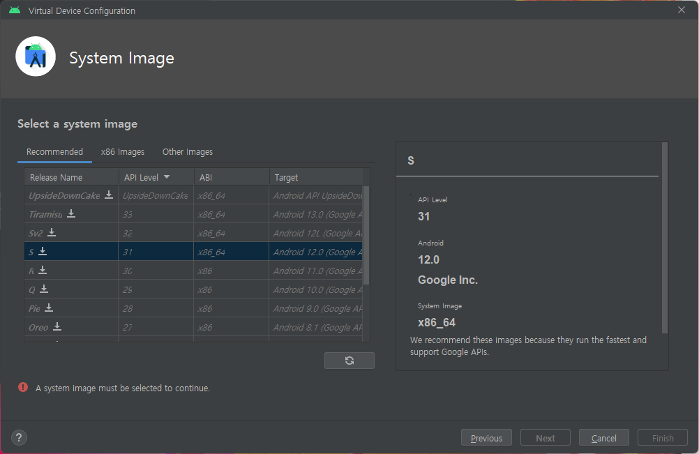 그럼 Virtual Device가 나오고 그걸 실행시키면됨